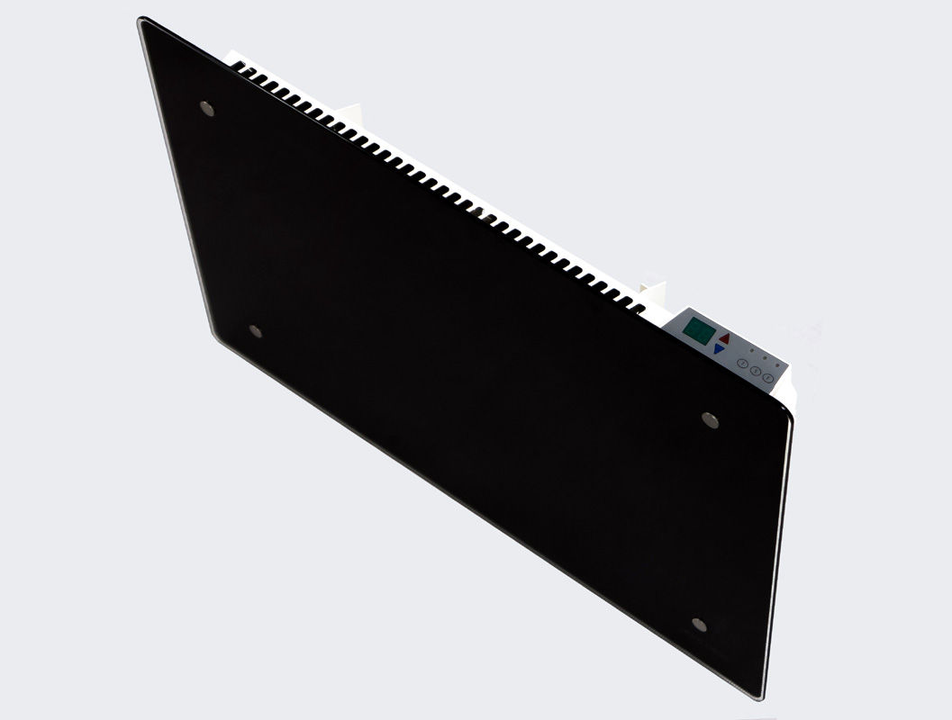 Ozdobny grzejnik wiszący z czołową płytą szklaną, w kolorze czarnym.